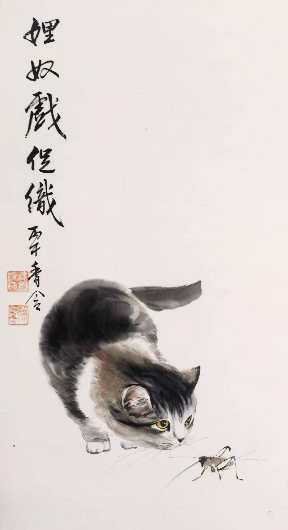 世人称陈香含老师为“猫王”画家,从不是对“画猫名家”的泛称,而是对她独辟蹊径的艺术造诣的最高赞誉。古往今来,画猫者众多,或工笔求形,或写意求趣,却少有能将“猫之灵”与“俗之喜”、“墨之韵”完美融合者。陈香含老师的猫,是有着“烟火气”的灵物,更是有着“文化根”的生灵。她笔下的猫,既能入得文人画的雅堂,又能登得百姓家的春案,这份“雅俗共赏”,正是她对传统书画的当代诠释,也是她在书画界独树一帜的核心。而此次为丙午新春创作的几幅猫作,更是将这份特质发挥到了极致。