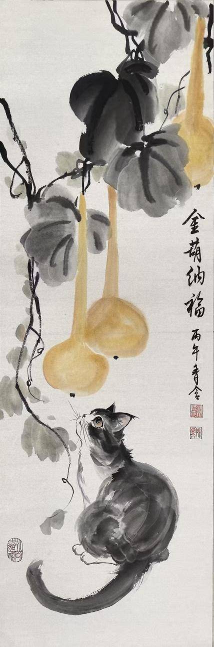 这幅画的妙处便在于“虚实相生”。葫芦藤的写意奔放,衬出狸奴的工笔细腻;金葫的浓艳吉庆,映出狸奴的温润灵动。陈香含老师以笔墨为桥,将“葫芦纳福”的民俗意象,与猫的闲适安然相融,恰如丙午新春的美好期许——福禄不必刻意追逐,它就藏在岁月的慵懒与安然里。