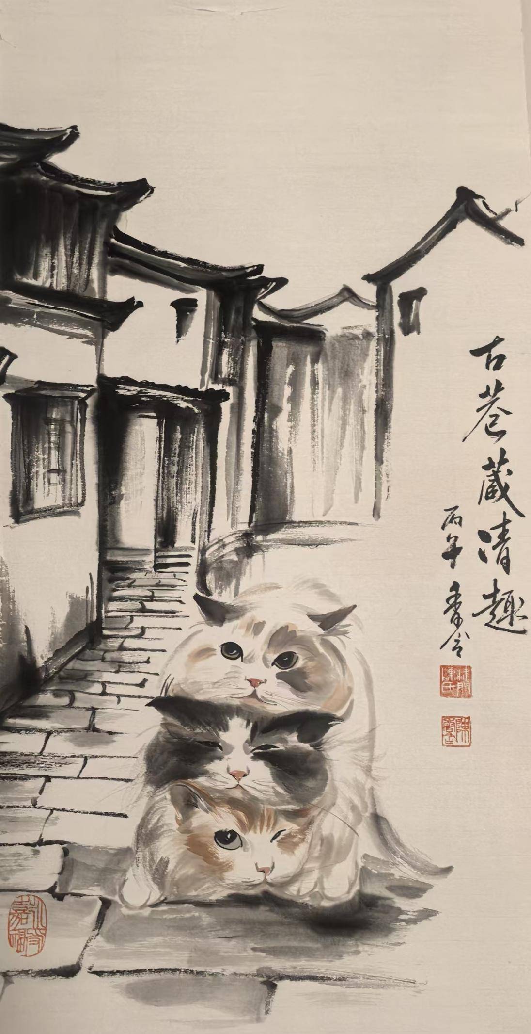 《古巷藏清趣》,则是对“家”与“根”的深情回望。江南古巷,白墙黛瓦,三只狸猫叠坐相依,这是新年春节最动人的烟火气。无论时代如何变迁,人们心中最柔软的牵挂,永远是这古巷深处的家。这幅画,是陈香含对人间温情的最好诠释,也是对新年团圆美满的真挚祝福。